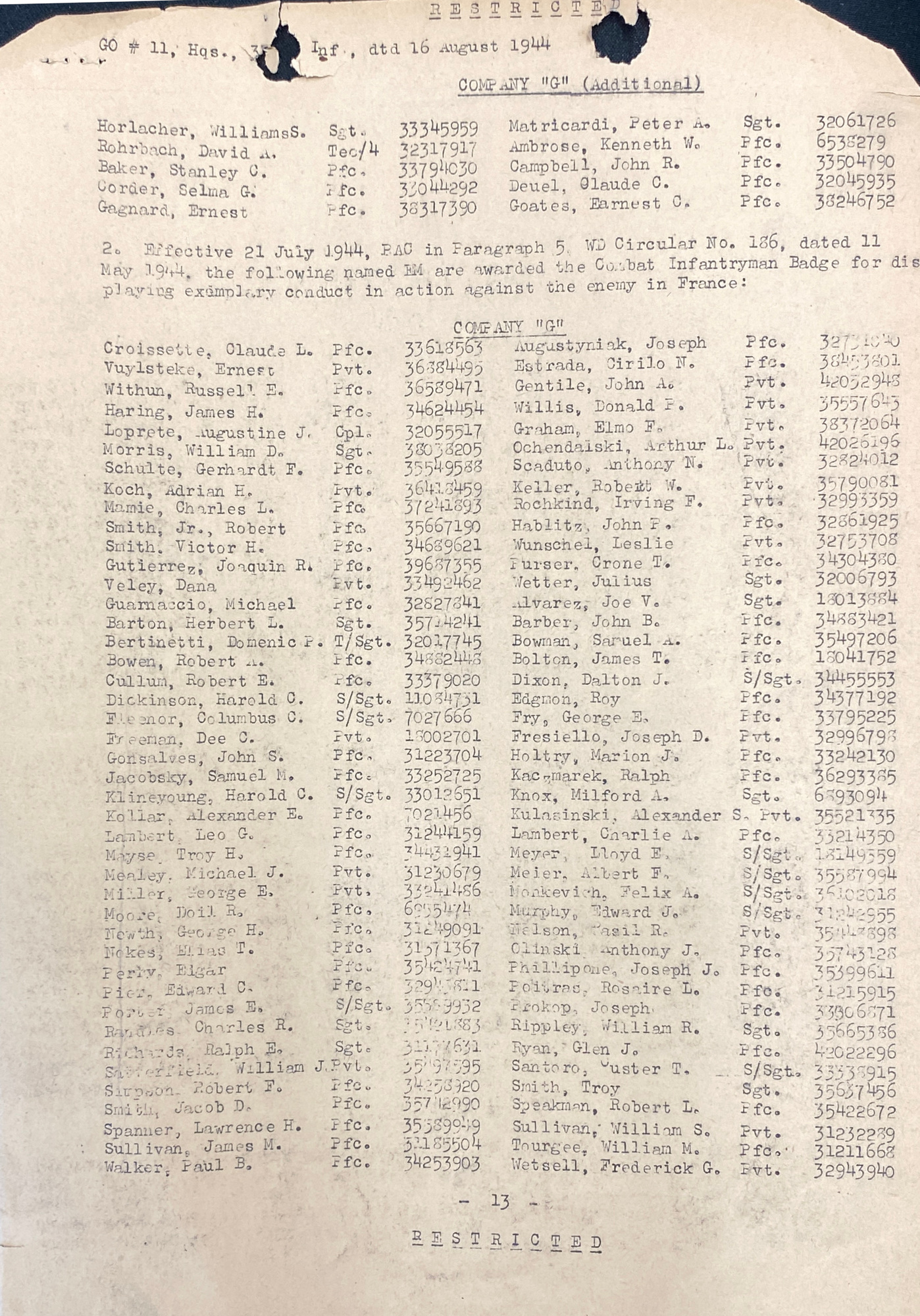 | Listed in 331st Infantry Regiment After Action Report, February 1945: Awarded Posthumous Silver Star Medal, including citation. Issuing General Order unknown, see temporary entry for GO 83/1945/#0 above as a Staff Sergeant in 331 | 16 | ||||