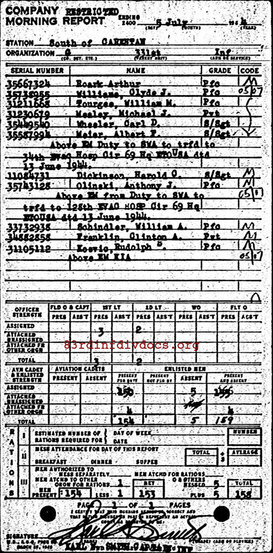 | 1944-07-05 | SSGT | Severely wounded in action and transferred to 34th Evacuation Hospital on July 5, 1944 | G / 331 | view page | |