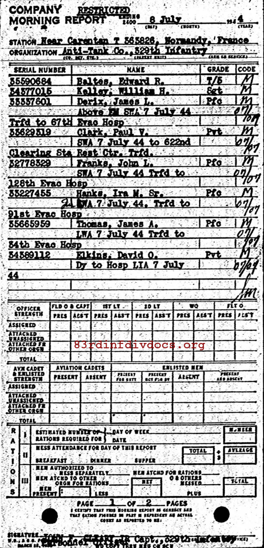 | Technician Fifth Grade Baltes was a member of the Anti Tank Company. The morning report for July 8, 1944 on page 8 shows him being severely wounded in action on July 7, 1944 and transfered to the 67th Evac Hospital. Page 8 can be seen here as well. |