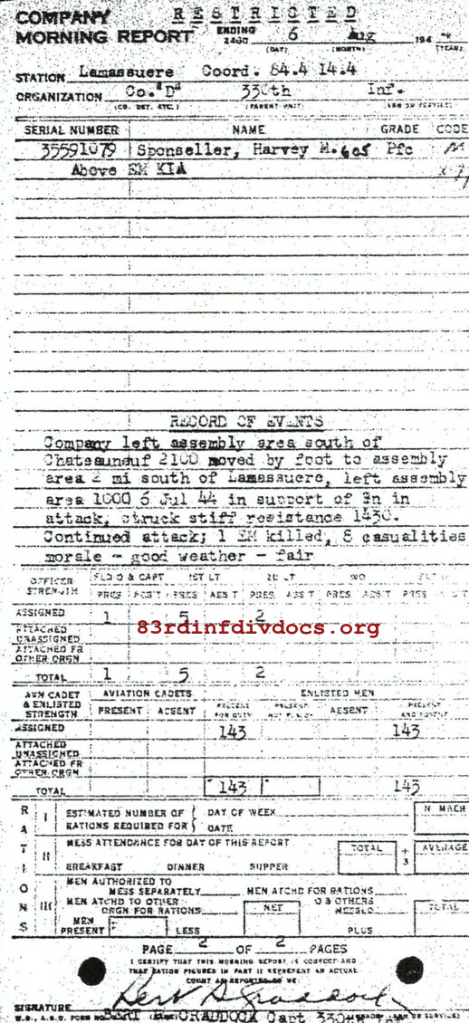 | Private First Class Sponseller was a member of D Company. The morning report for July 21, 1944 on page 25 lists him as a non battle casualty and transferred to a hospital. Page 26, for July 22, 1944, lists him returning to duty. The morning report for August 6, 1944 on page 8 lists as killed in action. The page can be seen below. |