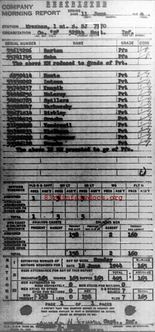 | 1944-06-11 | PFC | Rank reduced to Private as of June 11, 1944 | D / 329 | view page | |