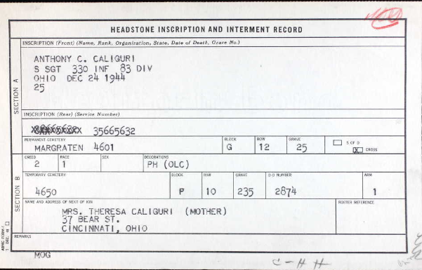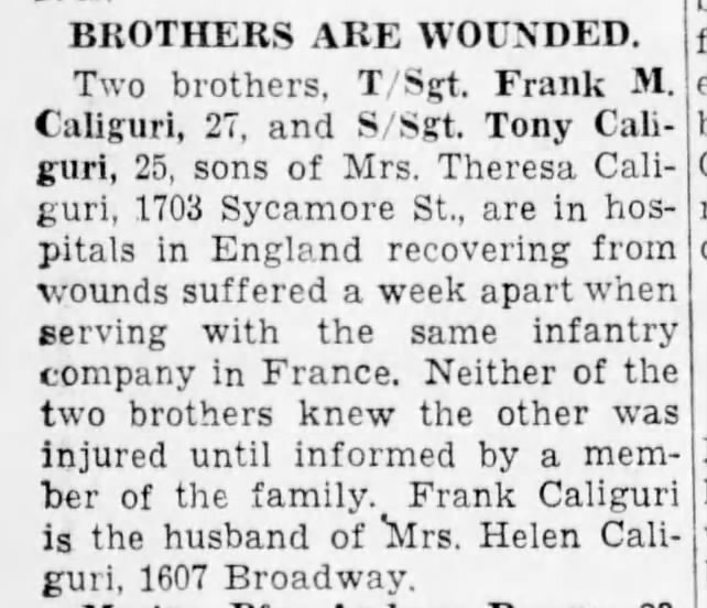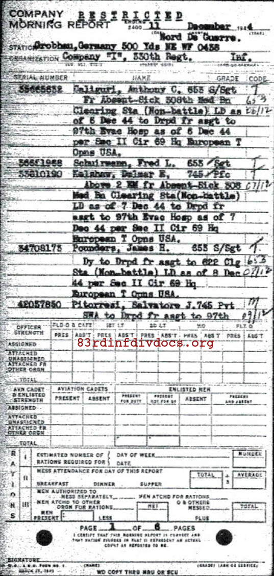 | Staff Sergeant Caliguri was a member of I Company. The morning report for July 6, 1944 on page 7 lists him as severely wounded in action and transferred to the 622nd Clearing Station. The morning report for December 9, 1944 on page 13 lists him being sick as of December 6, 1944. Page 19, for December 11, 1944, lists him as a non battle ca sualty and transferred to the 97th Evacuation Hospital on December 6, 1944. Page 43, for December 22, 1944, lists him returning to duty. Page 50, for December 28, 1944, list as missing in action as of December 24, 1944. The pages can be seen below. |
