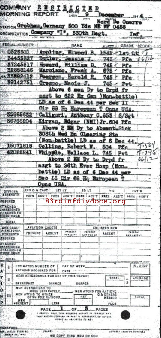 | 1944-12-09 | SSGT | Non battle casualty and duty to Clearing Station, 308th Medical Battalion on December 6, 1944 | 653 | I / 330 | view page |