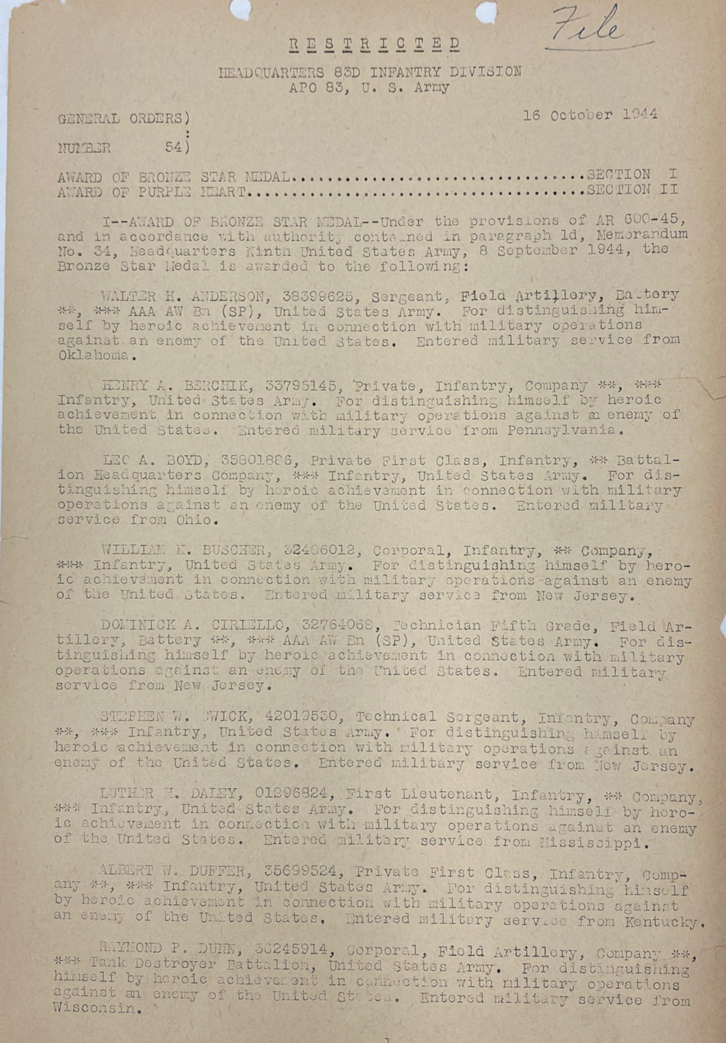 | Listed in 330th Infantry Regiment Casualties and Awards: Bronze Star Medal for Heroic Achievement in General Order 54 as a Private First Class in I/330 | 84 | ||||