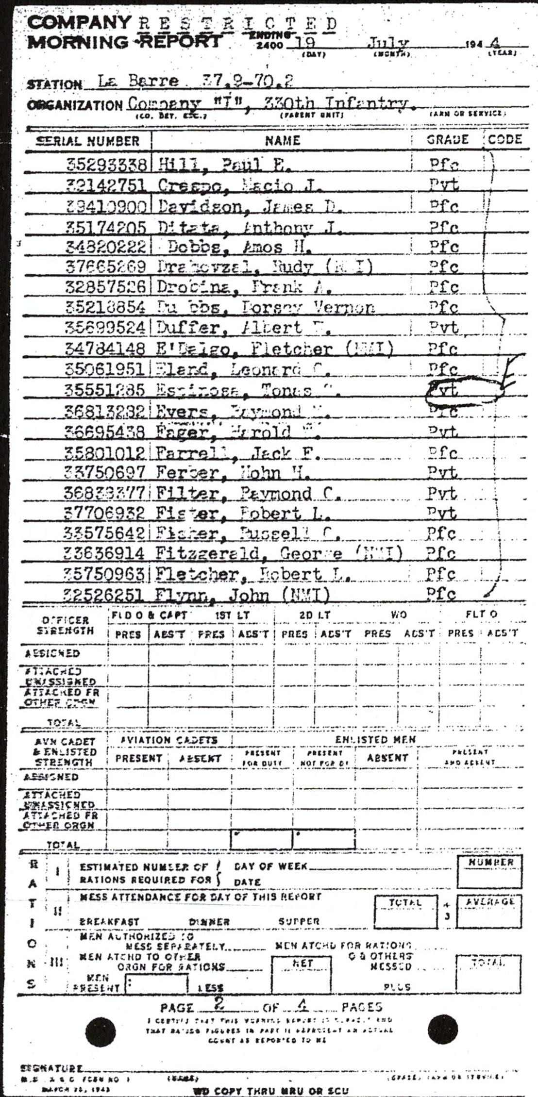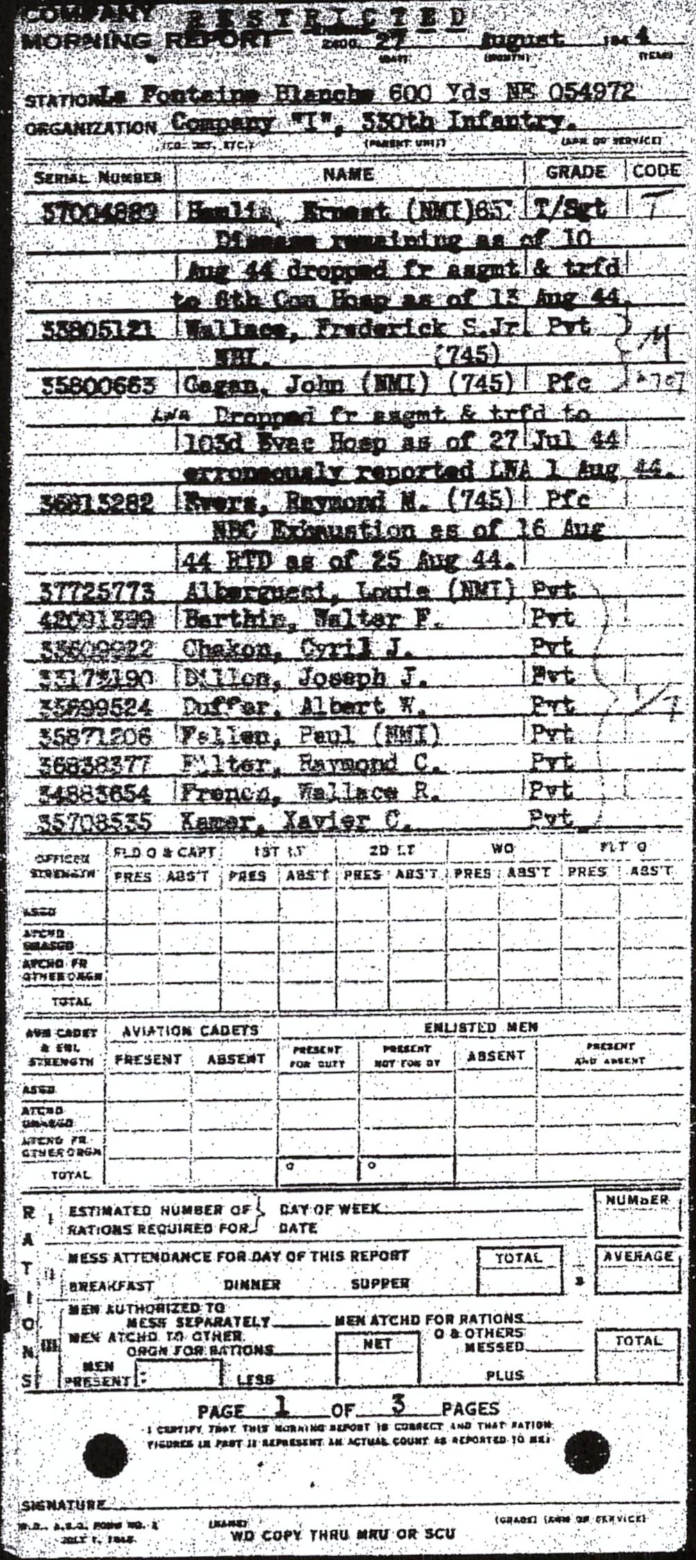 | 1944-07-19 | PVT | Assigned and joined from 41st Replacement Battalion as of July 19, 1944 | I / 330 | view page | |