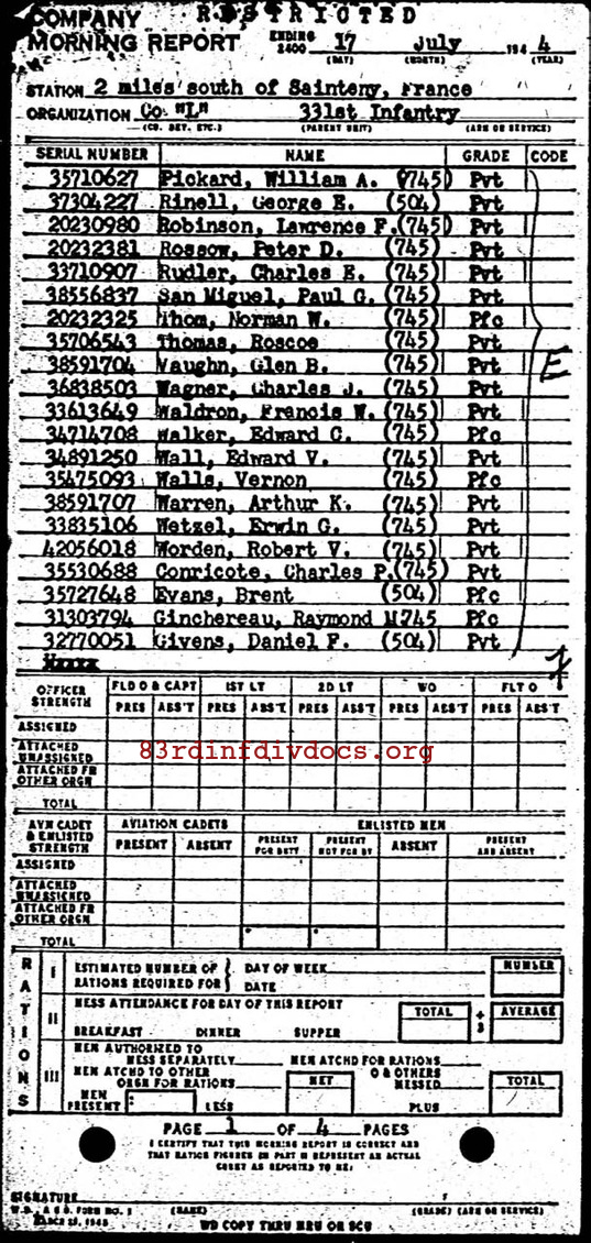 | Private First Class Thomas was a member of L Company. The morning report for July 17, 1944 on pages 25 and 26 show him joining L Company from the 46th Replacement Battalion per July 16, 1944. The pages can be seen below