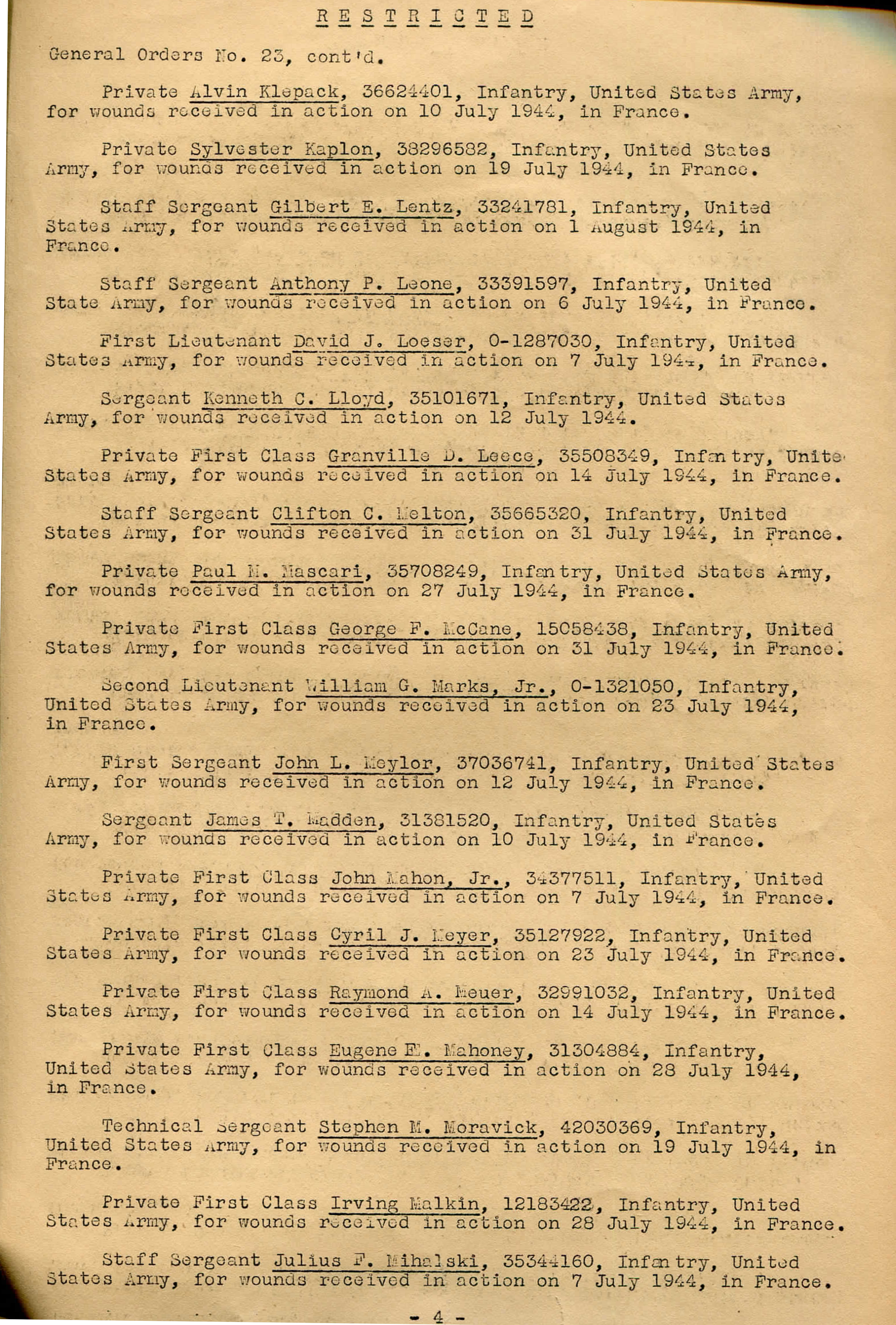 | Private Mascari was a member of A Company. The morning report for August 15, 1944 on page 21 shows him killed in action on August 13, 1944. Page 21 can be seen below. General Order 23 lists his commendation for a Purple Heart for wounds received in action on July 27, 1944. |