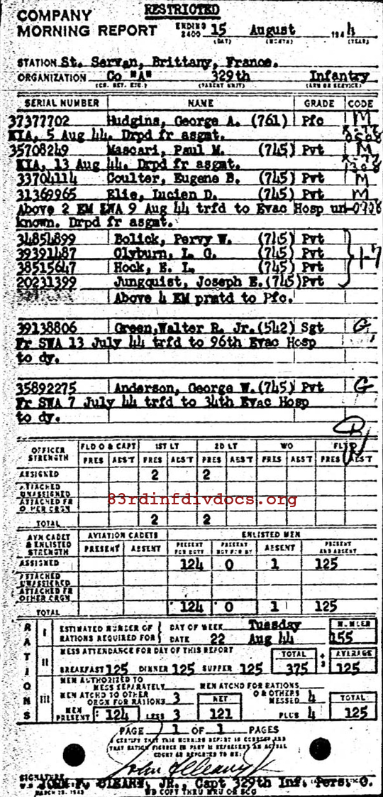 | 1944-08-15 | PVT | Killed in action on August 13, 1944 | 745 | A / 329 | view page |