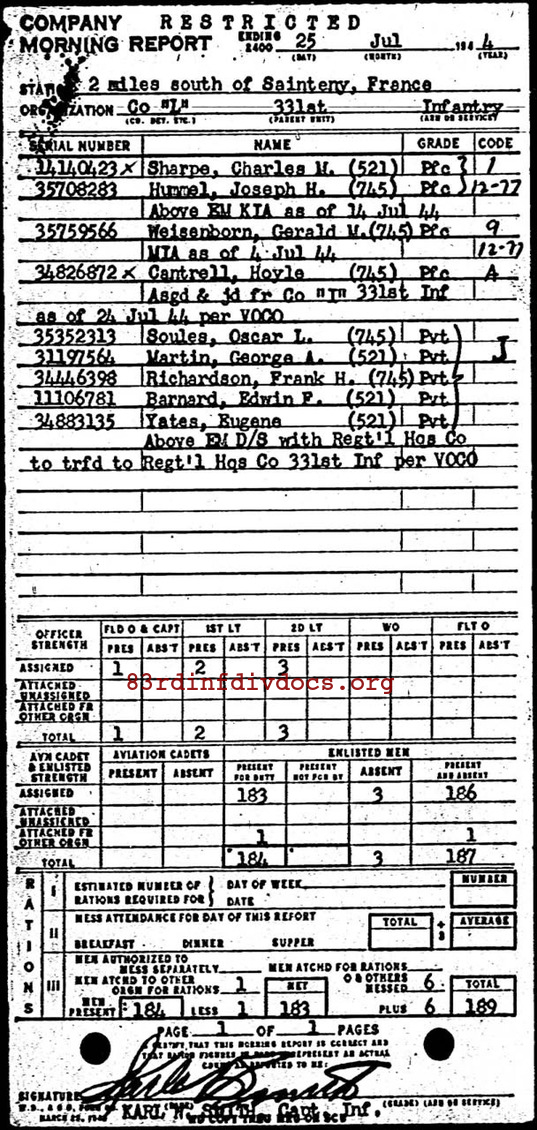 | Private First Class Hummel was a member of L Company. The morning report for July 25, 1944 on page 40 shows his status changed to Killed in Action on July 14, 1944. The page can be seen below. |