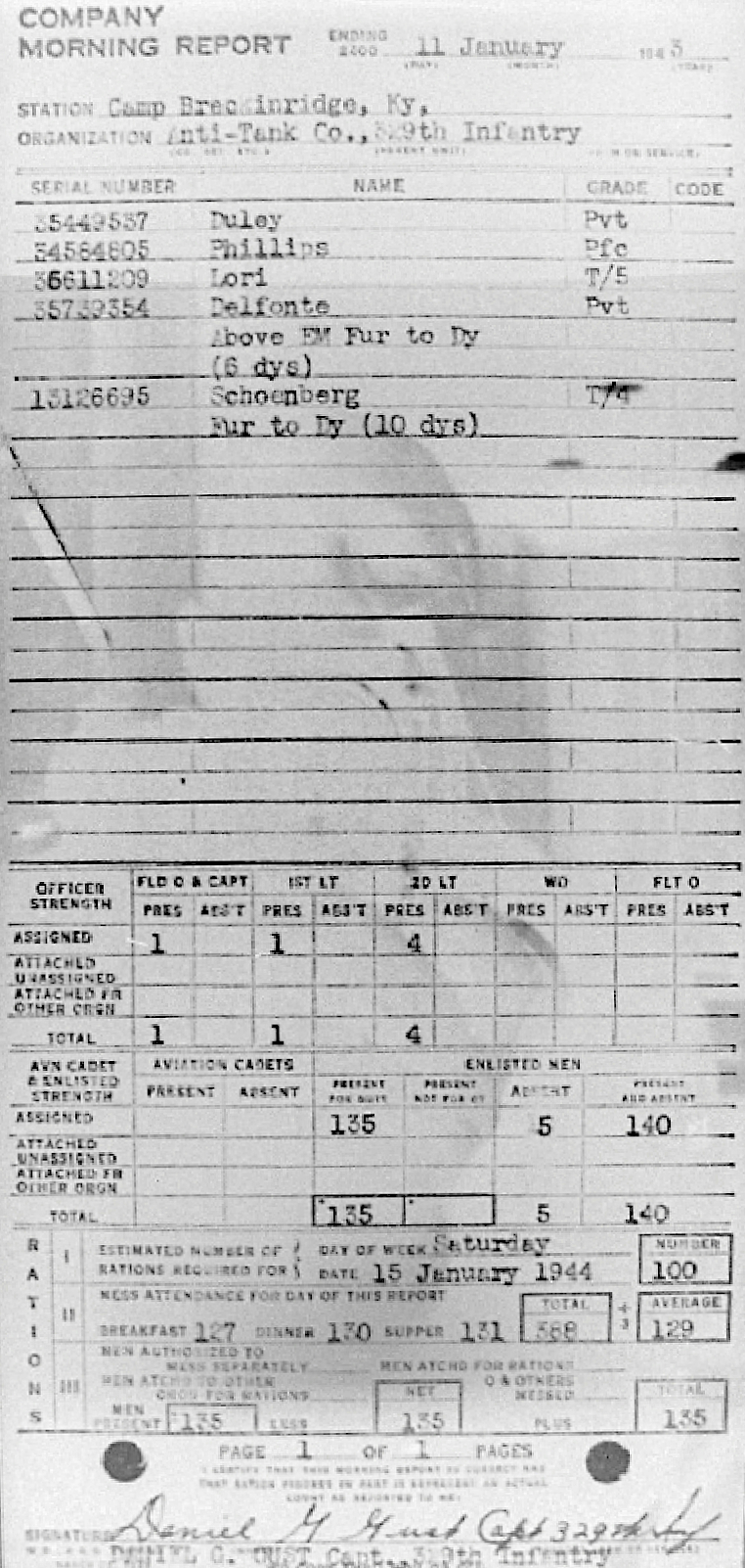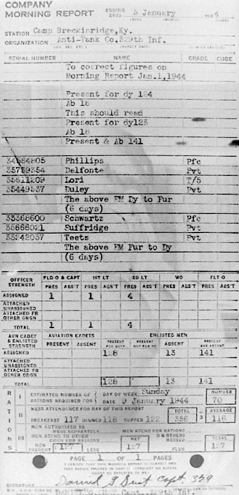 | 1944-01-11 | PVT | Returned to duty from six day furlough on January 11, 1944 | ATCO / 329 | view page | |