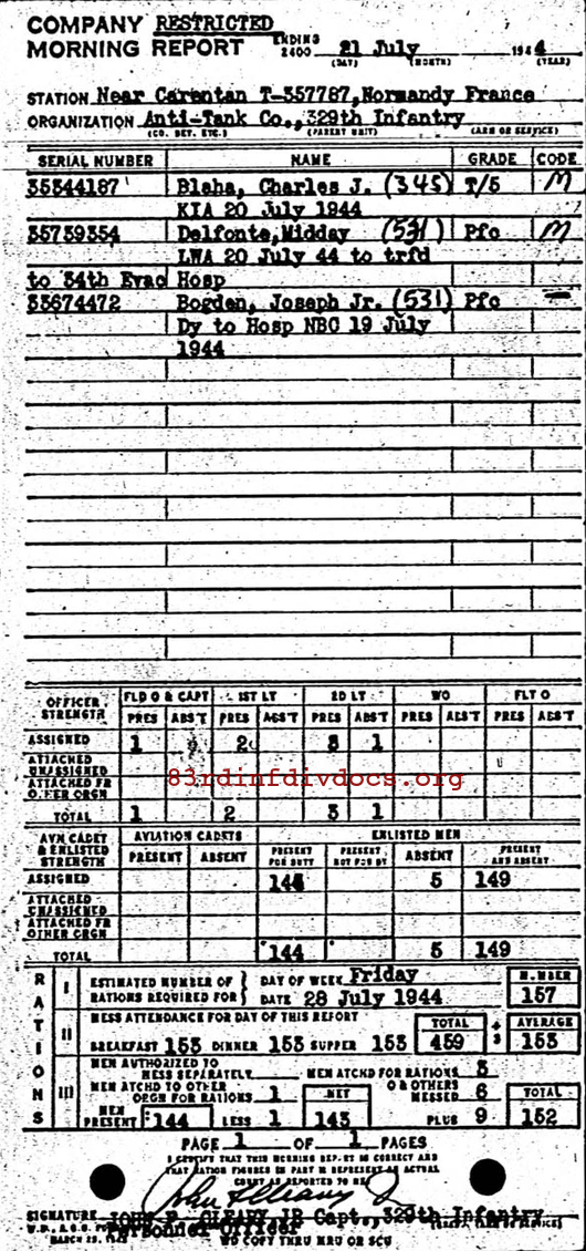 | Unit | Anti-tank Company, 329th Infantry Regiment, 83rd Infantry Division |