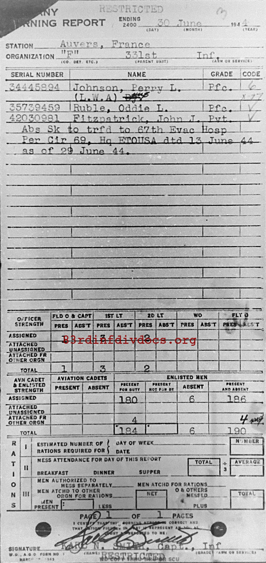 | Private First Class Ruble was a member of F Company. The morning report for June 29, 1944, shows PFC Ruble as Severely Injured in Action and evacuated. The page can be seen below. |