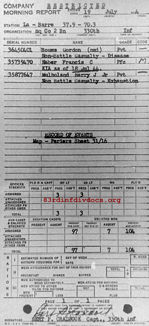 | 1944-07-19 | PFC | Killed in action on July 18, 1944 | HQCO2BN / 330 | view page | |