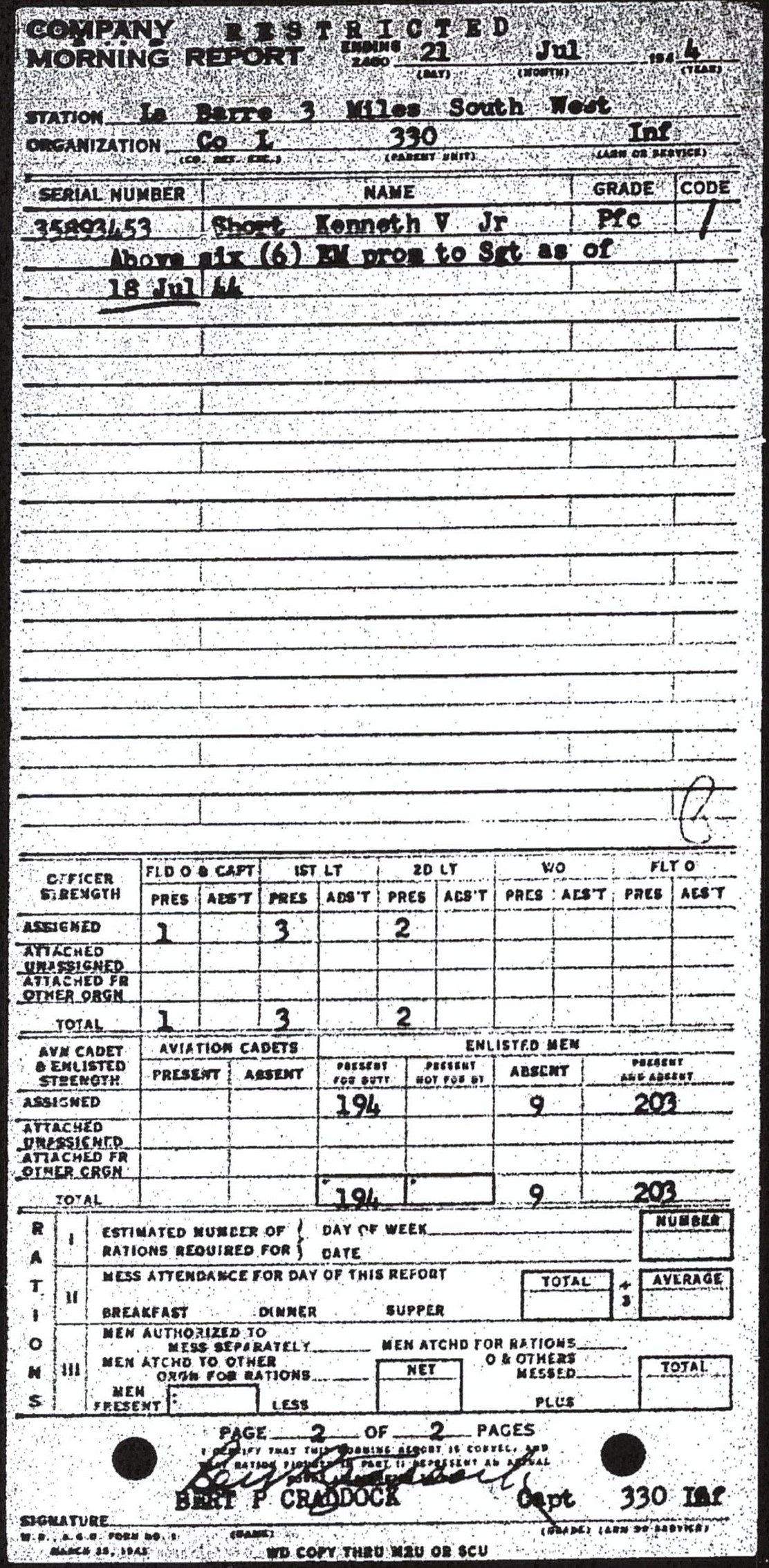 | 1944-07-21 | PFC | Promoted to Sergeant as of July 18, 1944 | L / 330 | view page | |