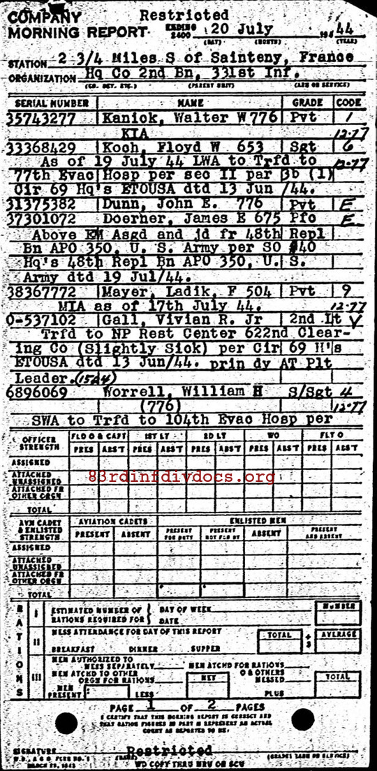 | 1944-07-20 | PVT | Killed in action on July 20, 1944 | 776 | HQCO2BN / 331 | view page |