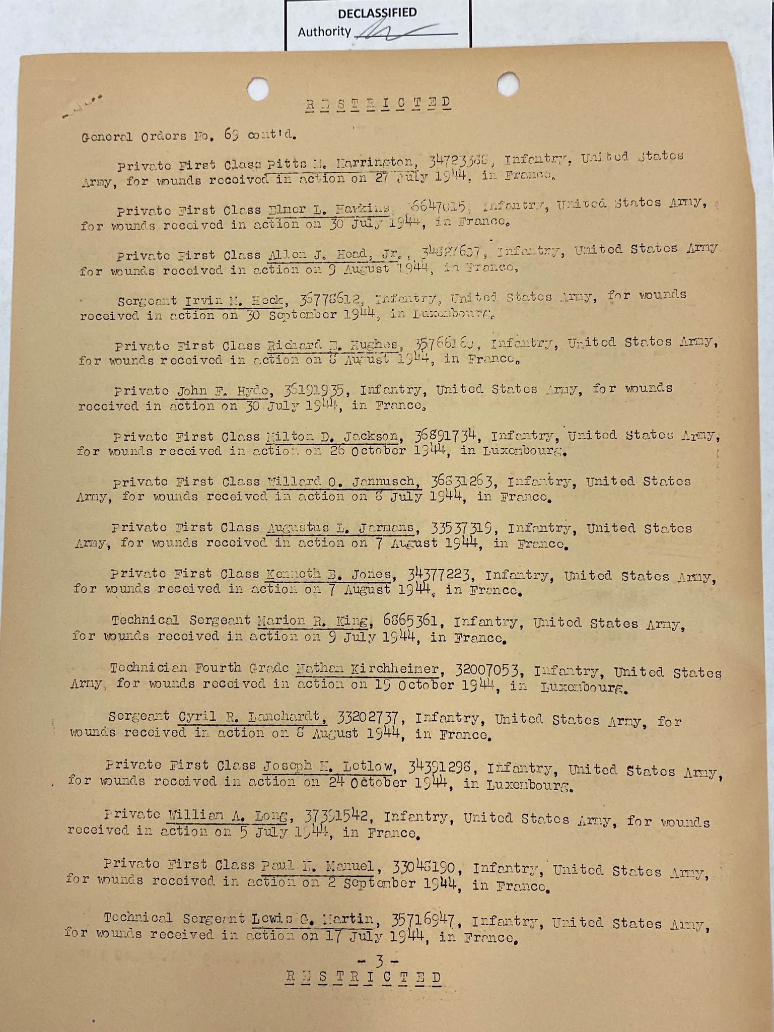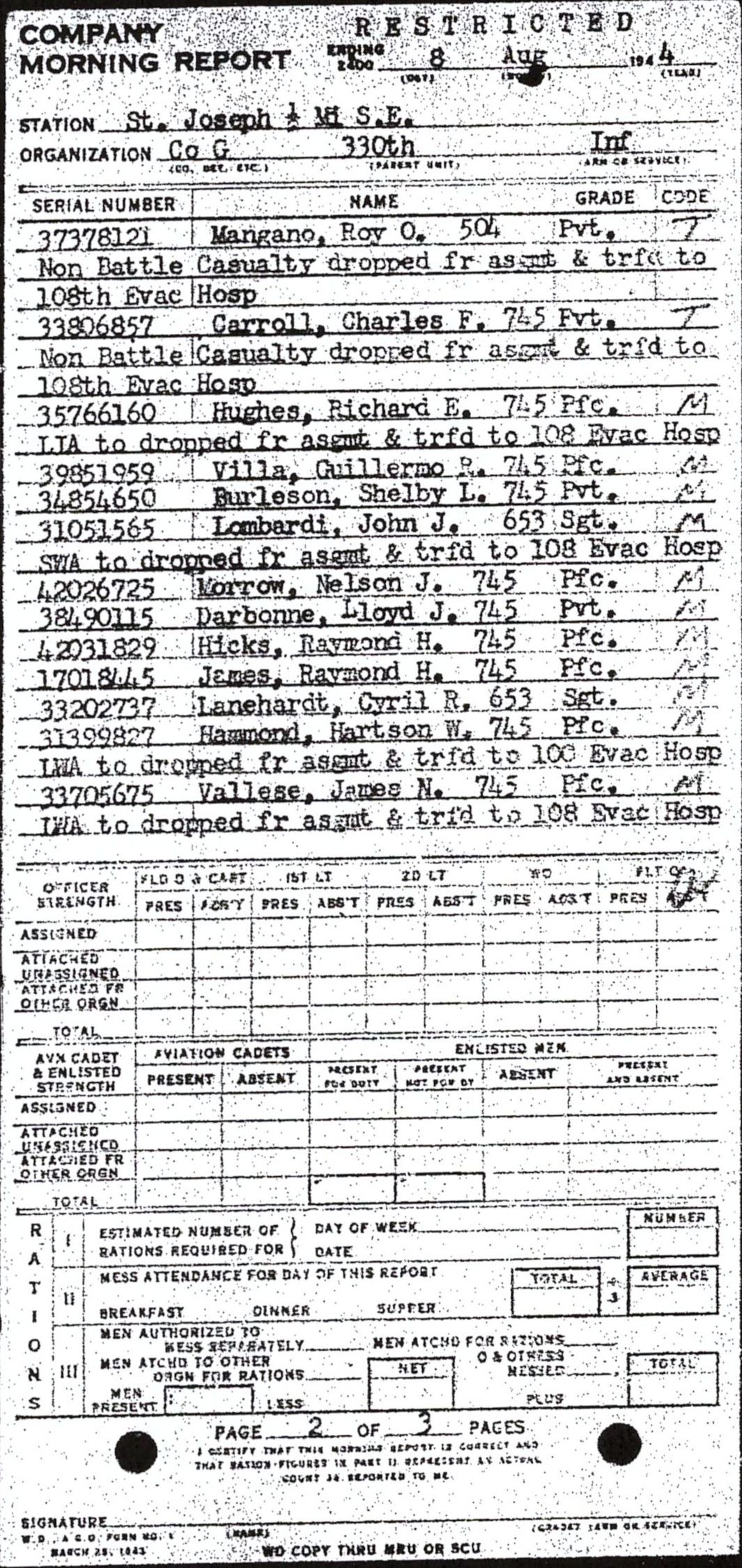 | 1944-08-08 | PFC | Lightly injured in action and transferred to 108th Evacuation Hospital on August 8, 1944 | 745 | G / 330 | view page |