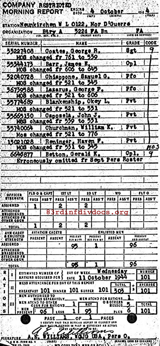 | Unit | Btry A, 322nd Field Artillery Battalion, 83rd Infantry Division |