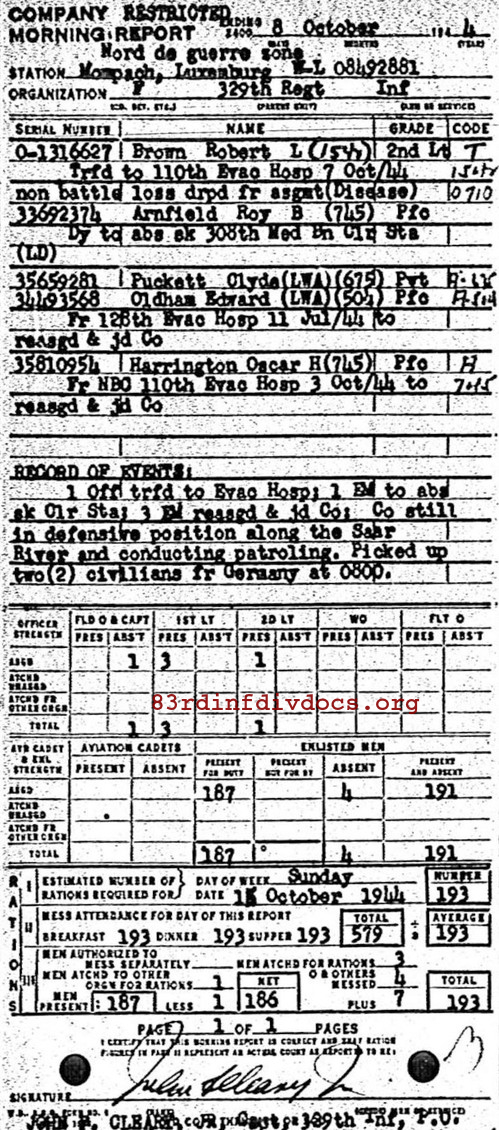 | Staff Sergeant Harrington was a member of F Company. The morning report for October 3, 1944 on page 3 lists him as a non battle casualty and transferred to the 110th Evacuation Hospital while holding the rank of Private First Class. Page 8, for October 8, 1944 shows him rejoining the unit. All pages can be seen below. Since we have no later documents we assume that Staff Sergeant Harrington died while serving in F Company. |