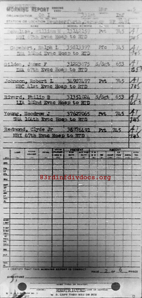 | 1945-01-16 | PFC | Lightly wounded in action and transferred to 102nd Evacuation Hospital on January 15, 1945 | 745 | L / 331 | view page |
