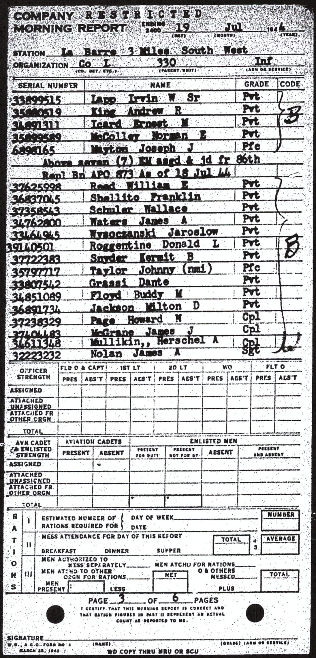 | 1944-07-19 | PVT | Assigned and joined from 86th Replacement Battalion as of July 18, 1944 | L / 330 | view page | |
