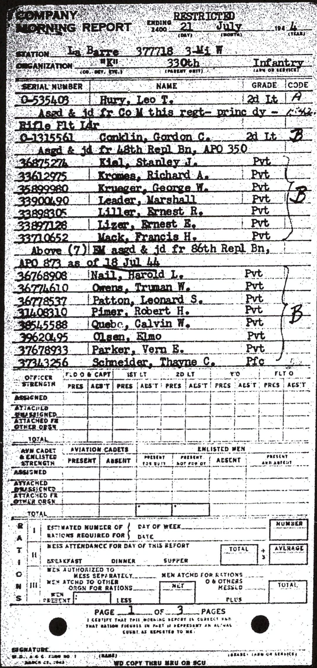 | 1944-07-21 | PVT | Assigned and joined from 86th Replacement Battalion as of July 18, 1944 | K / 330 | view page | |
