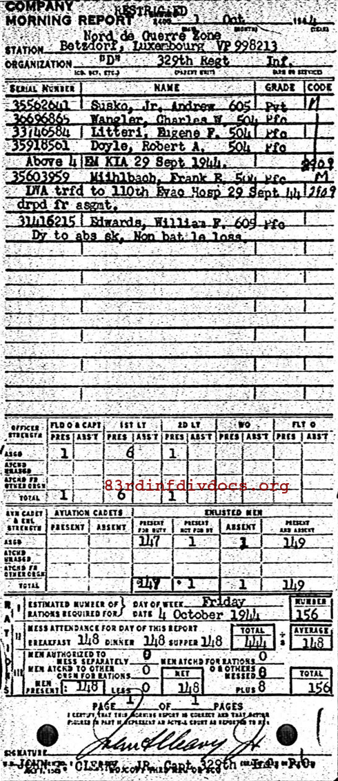 | Private First Class Doyle was a member of D Company. The morning report for October 1, 1944 on page 1 lists him killed in action on September 29, 1944. Page 1 can be seen here as well. |