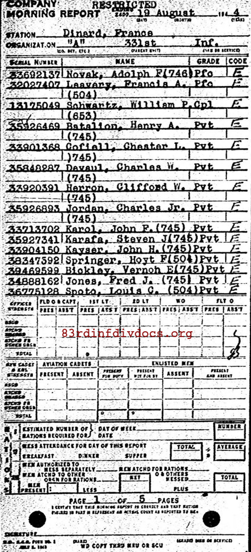 | Private First Class Karafa was a member of A Company. The morning report for August 19, 1944 on page 35 to 38 lists him joining the unit from the 53rd Replacement Battalion on August 16, 1944. The pages can be seen below. |