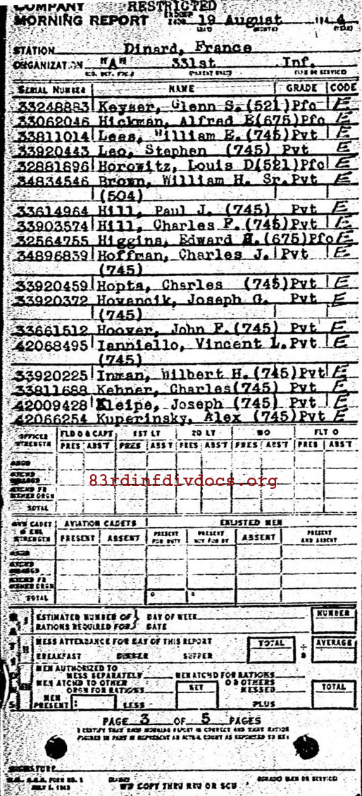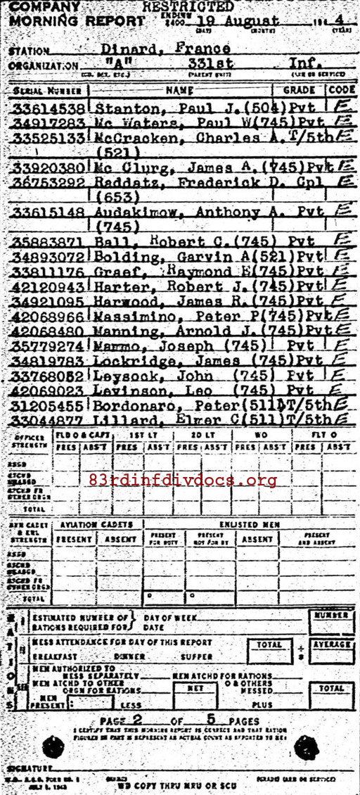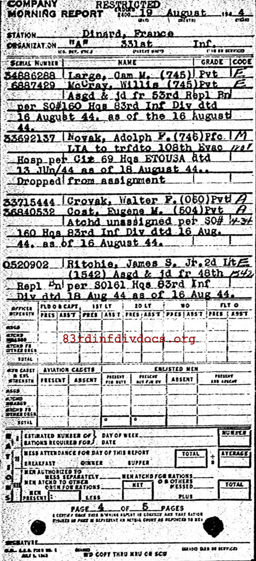 | 1944-08-19 | PVT | Assigned and joined from 53rd Replacement Battalion as of August 16, 1944 | 745 | A / 331 | view page |
