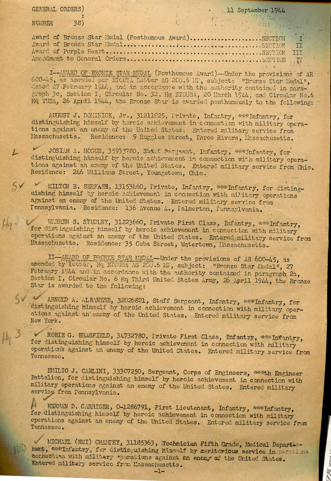 | Listed in 330th Infantry Regiment Casualties and Awards: Bronze Star Medal for Heroic Achievement (posthumously) in General Order 38 as a Staff Sergeant in L/330 | 86 | ||||
