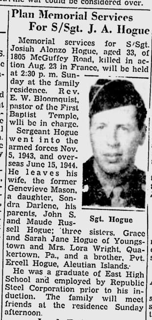 | Erwin Derhaag pointed me to a newspaper. From this article partially qouted: Memorial services for S/Sgt. Josiah Alonzo Hogue, aged 33, of 1805 McGuffey Road , killed in action Aug. 23 in France, will be held at 2:30 p.m. Sunday at the fa miliy residence. Rev. E.W. Bloomquist, pastor of the First Baptist Temple will b e in charge. Sergeant Hogue went into the armed forces Nov. 5, 1943, and oversea s June 15, 1944. He leaves his wife, the former Genevieve Mason, a daughter, Son dra Darlene, his parents, John S. and Maude Russel Hogue; three sisters, Grave a nd Sarah Jane Hogue of Youngstown and Mrs. Lora Wright, Quarkertown, Pa, and a b rother Pvt. Ercell Hogue, Aleutian Islands. He was a graduate of East High Schoo l and employed by the Republic Steel Corporation prior to his induction. The fam ily will meet friends at the residence Sunday afternoon. The article can be seen below. |