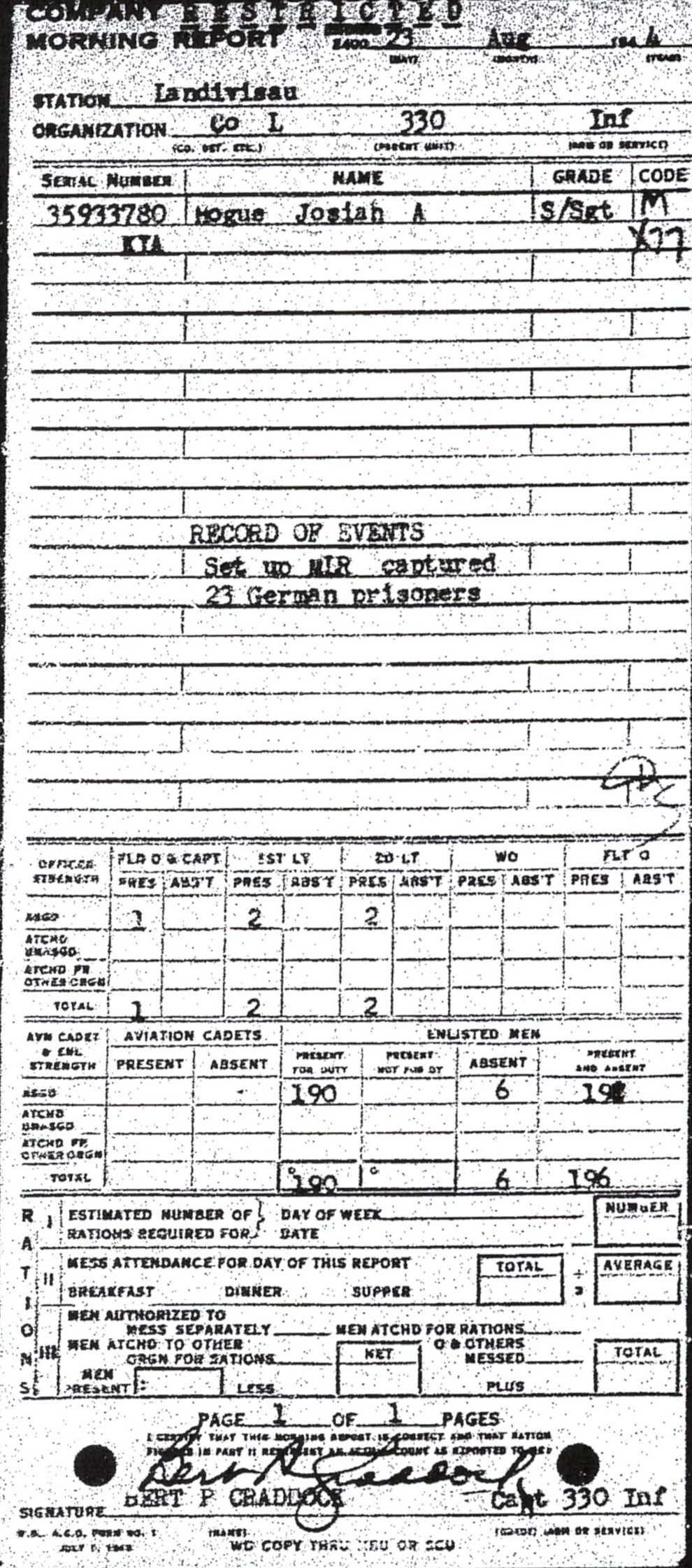 | 1944-08-23 | SSGT | Killed in action on August 23, 1944 | L / 330 | view page | |