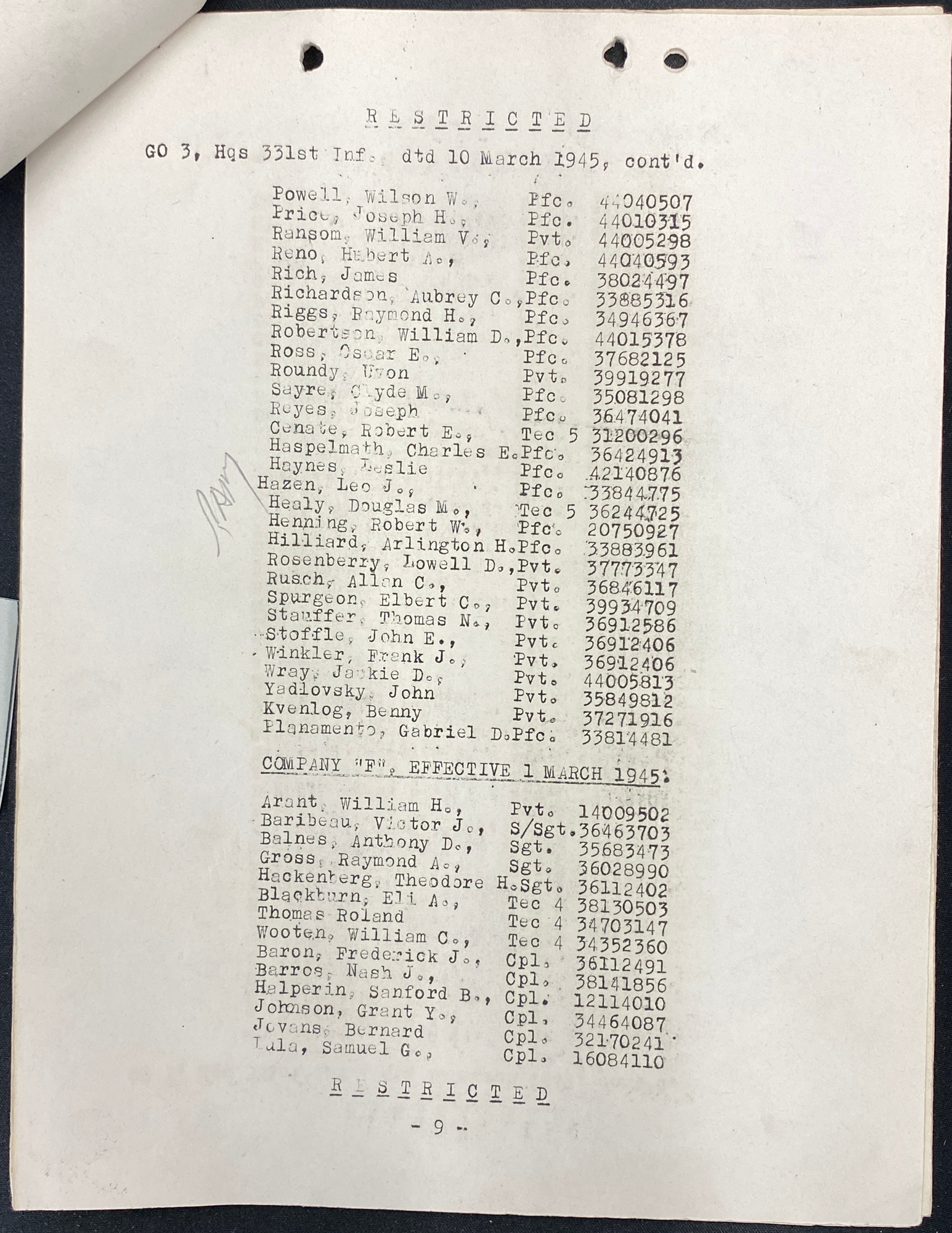 | 1945-03-11 | SGT | Promoted to Staff Sergeant, duty changed to Squad Leader (653) as of March 4, 1945 | 745 | F / 331 | view page |