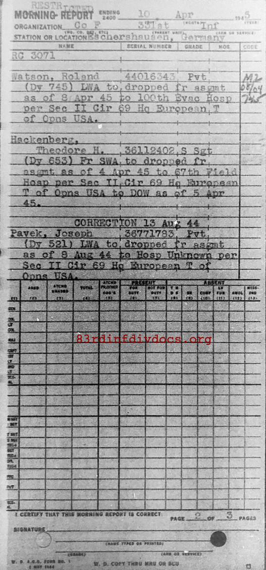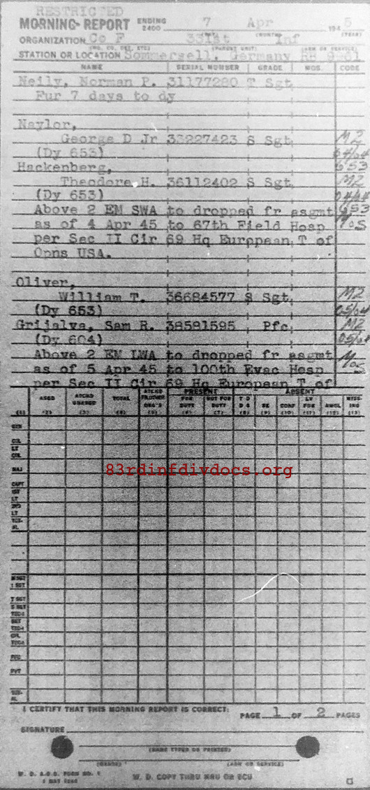 | 1945-04-07 | SSGT | Severely wounded in action and transferred to 67th Field Hospital on April 4, 1945 | 653 | F / 331 | view page |