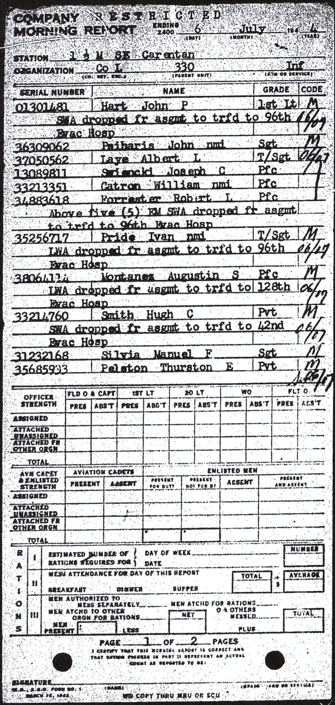 Severely wounded in action and transferred to 96th Evacuation Hospital on July 6, 1944 |