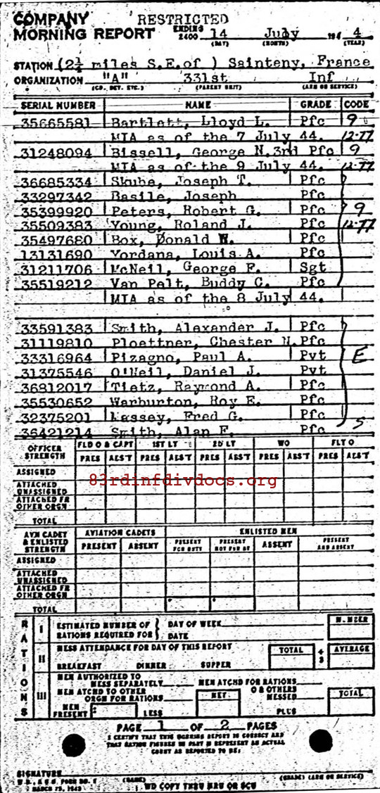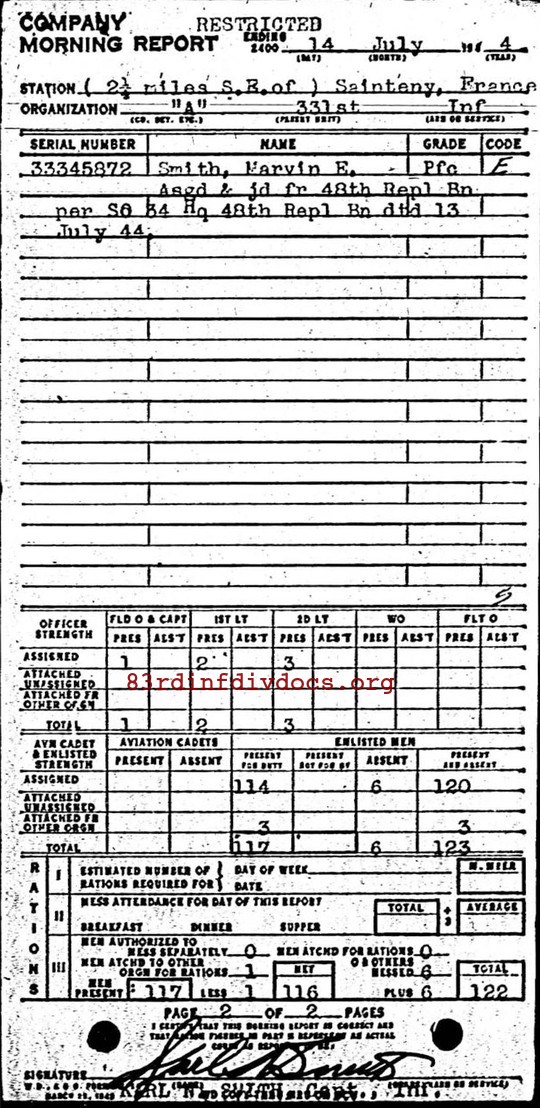 | Private First Class Smith was a member of A Company. The morning report for July 14, 1944 on page 25 and 26 lists him joining the unit from the 48th Replacement Battalion. The pages can be seen below.