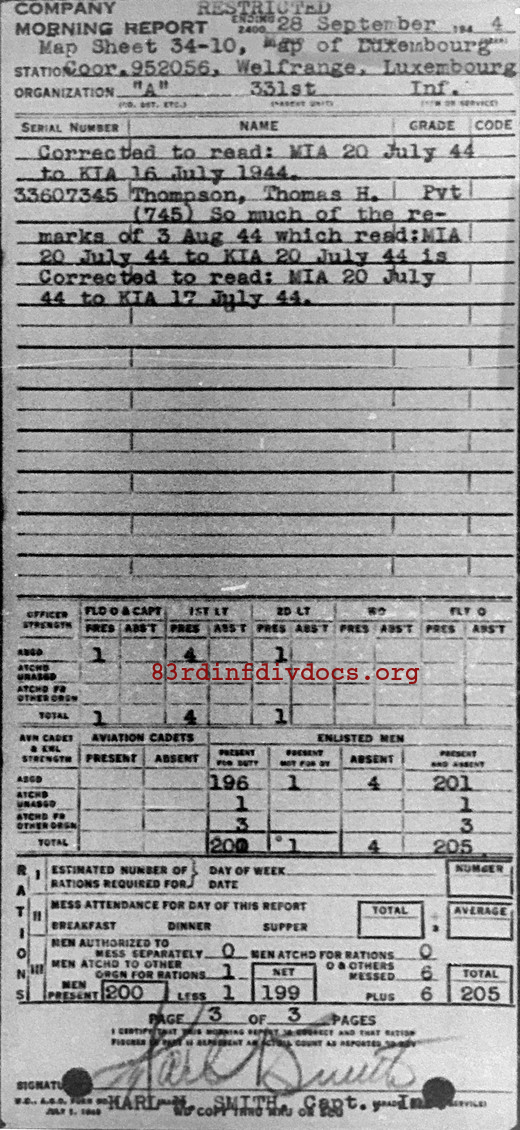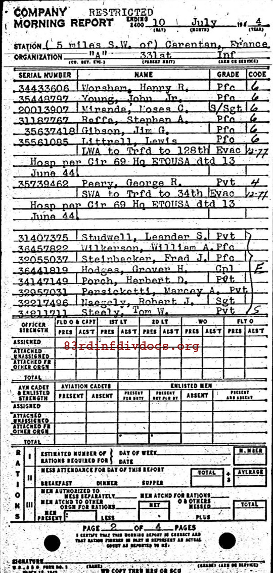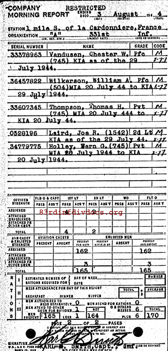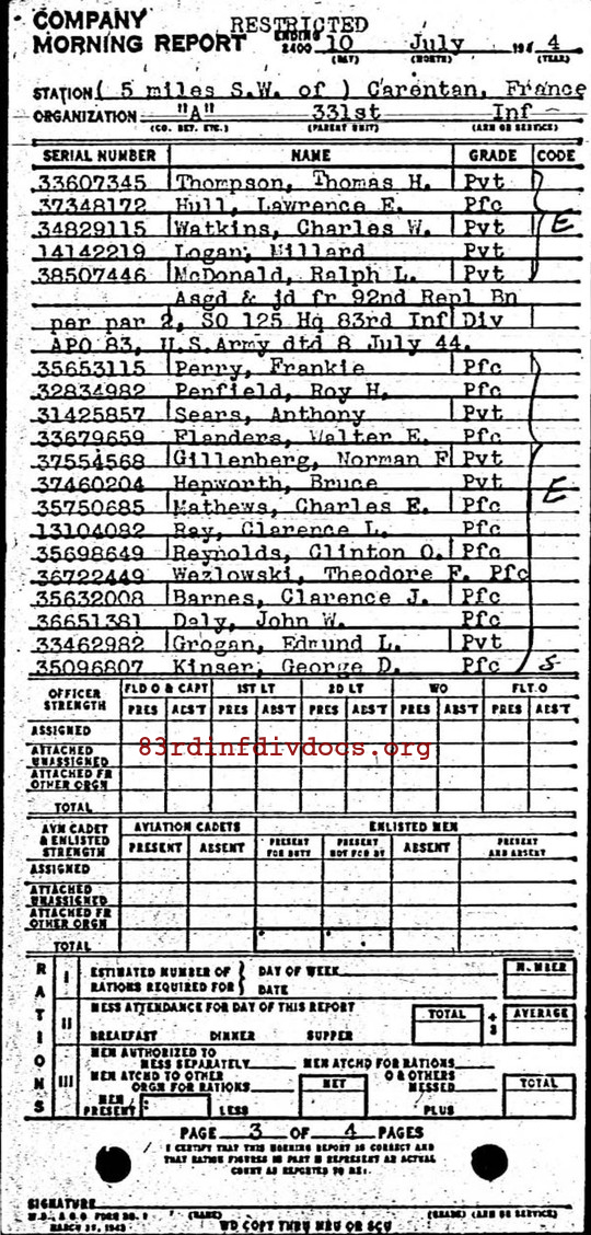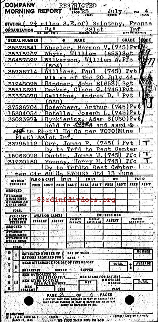 The morning reports confirm this. Private First Class Wilkerson was a member of A Company. The morning report for July 10, 1944 on page 13 and 14 lists him joining the unit from the 92nd Replacement Battalion on July 8, 1944. Page 54, for July 25, 1944, lists his status changed to missing in action per July 20, 1944. The morning report for August 3, 1944 on page 9, lists his status changed from missing in action to killed in action on July 29, 1944. The relevant pages can be seen below. |
