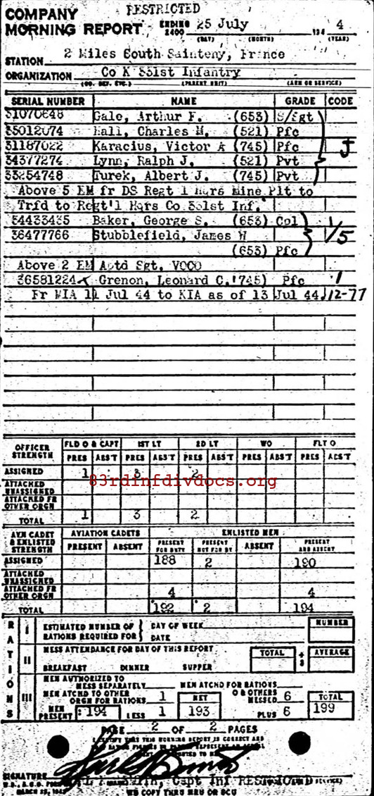 | 1944-07-25 | PFC | Killed in action on July 13, 1944 | 745 | K / 331 | view page |