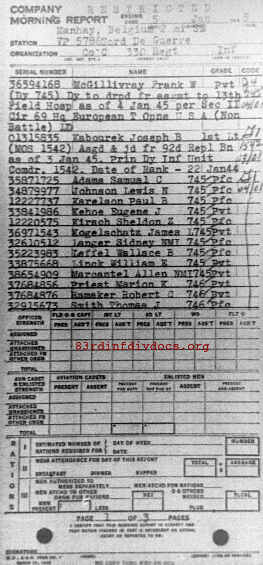 | 1945-01-05 | PVT | Non battle casualty and transferred to 13th Field Hospital on January 4, 1945 | 745 | C / 330 | view page |