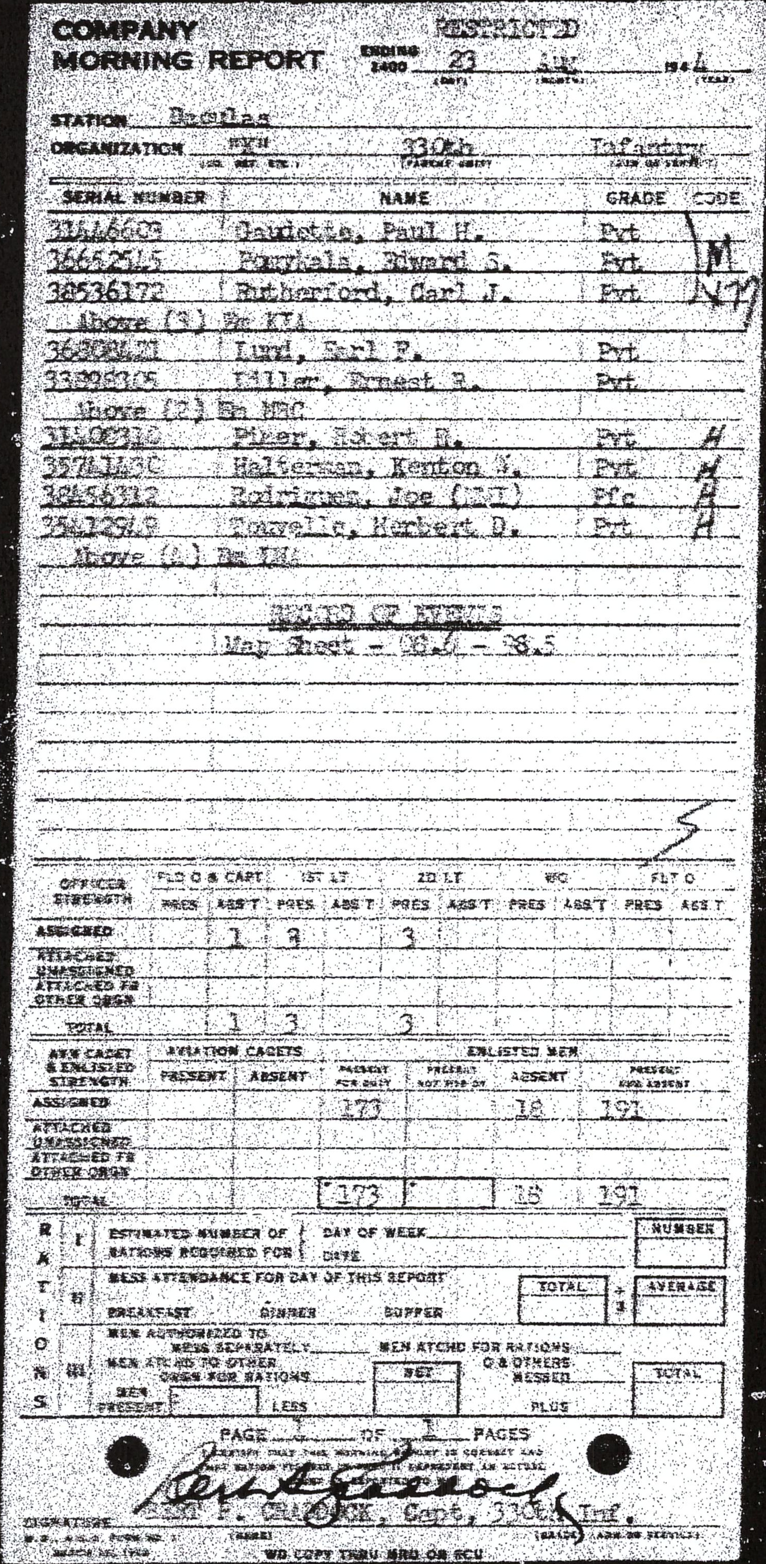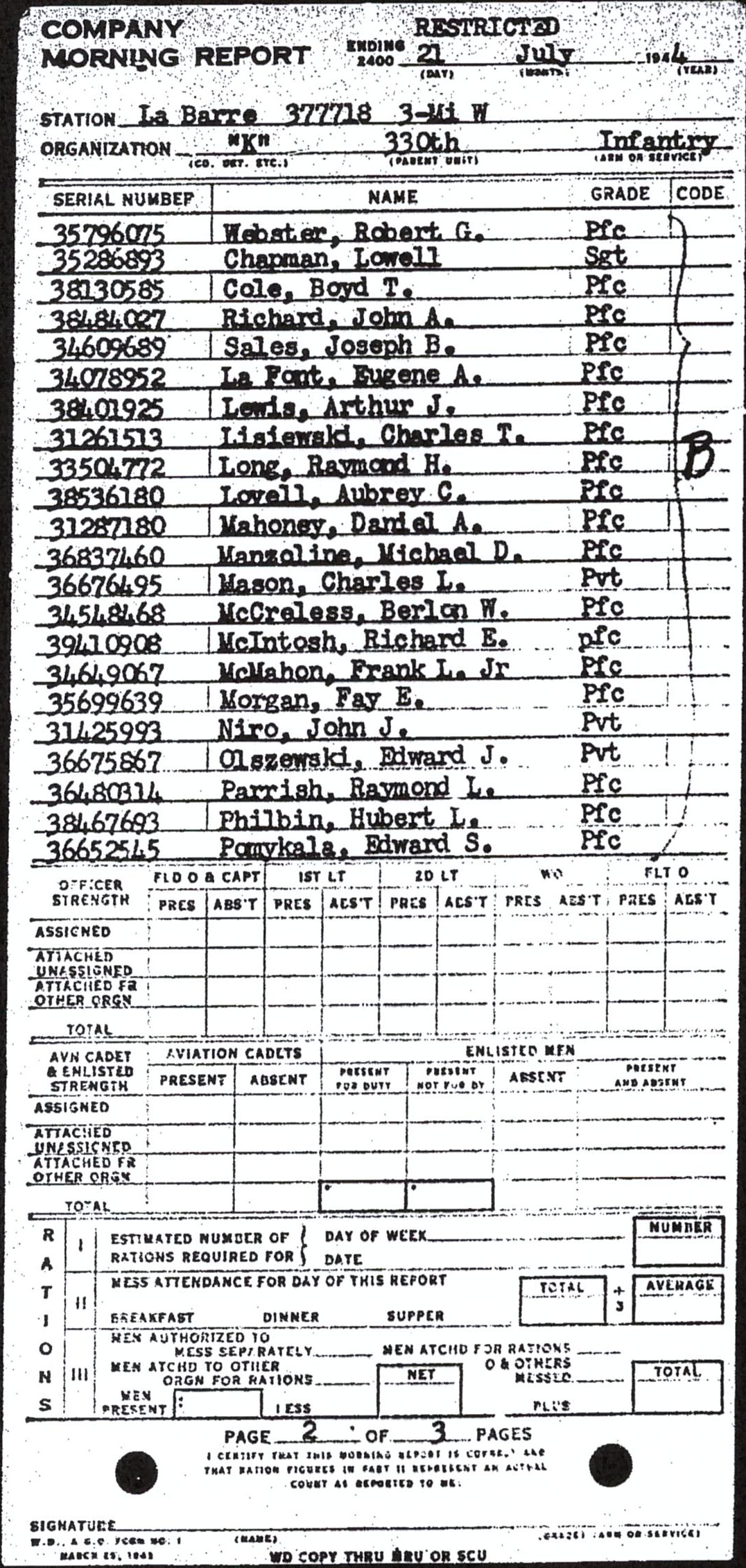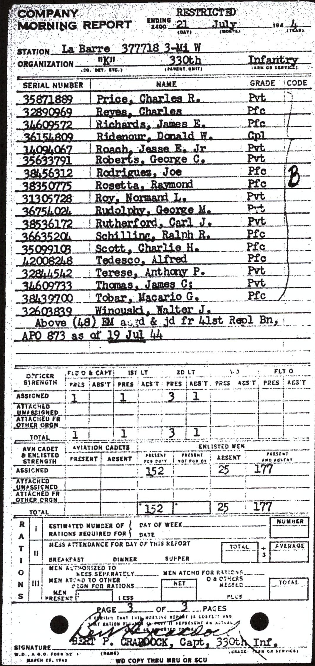 | 1944-07-21 | PFC | Assigned and joined from 41st Replacement Battalion as of July 19, 1944 | K / 330 | view page | |