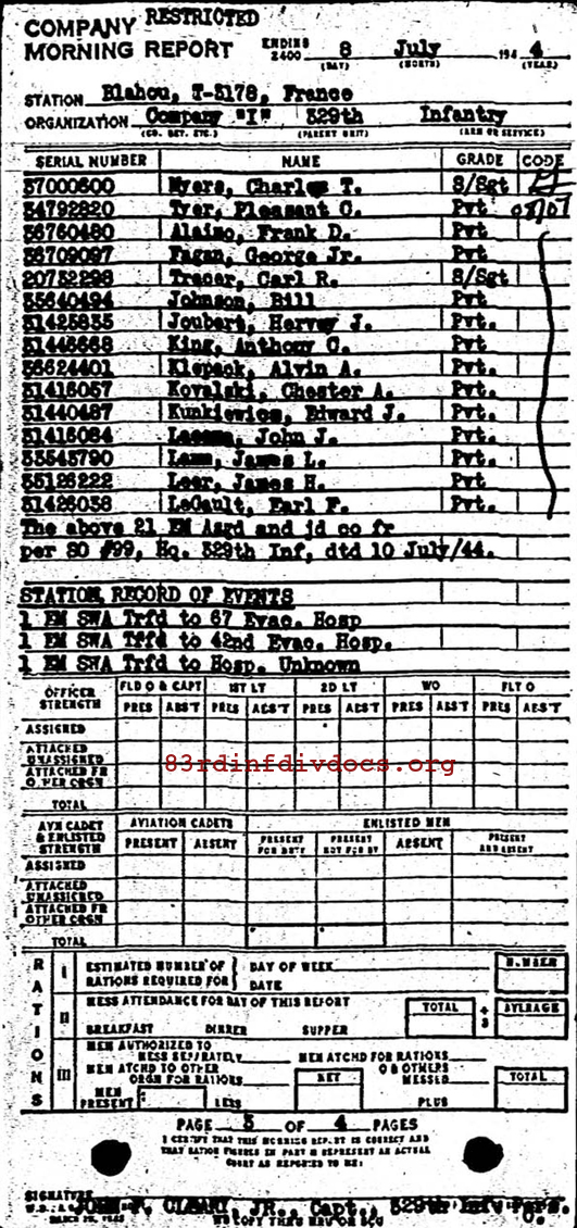 | 1944-07-08 | PVT | Assigned and joined from unknown unit as of July 8, 1944 | I / 329 | view page | |
