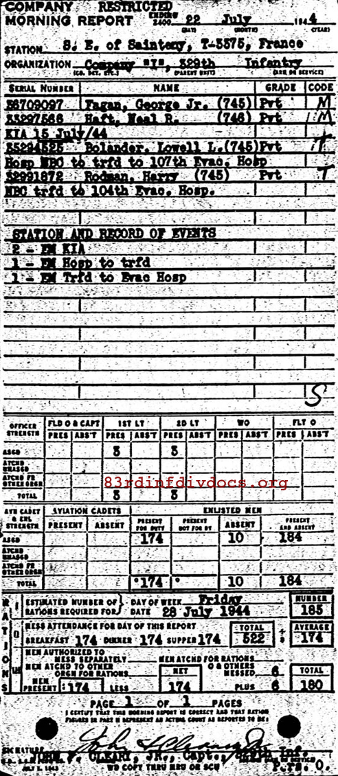 | 1944-07-22 | PVT | Killed in action on July 15, 1944 | 745 | I / 329 | view page |