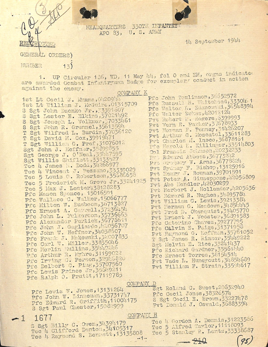 | Unit | K Company, 330th Infantry Regiment, 83rd Infantry Division |