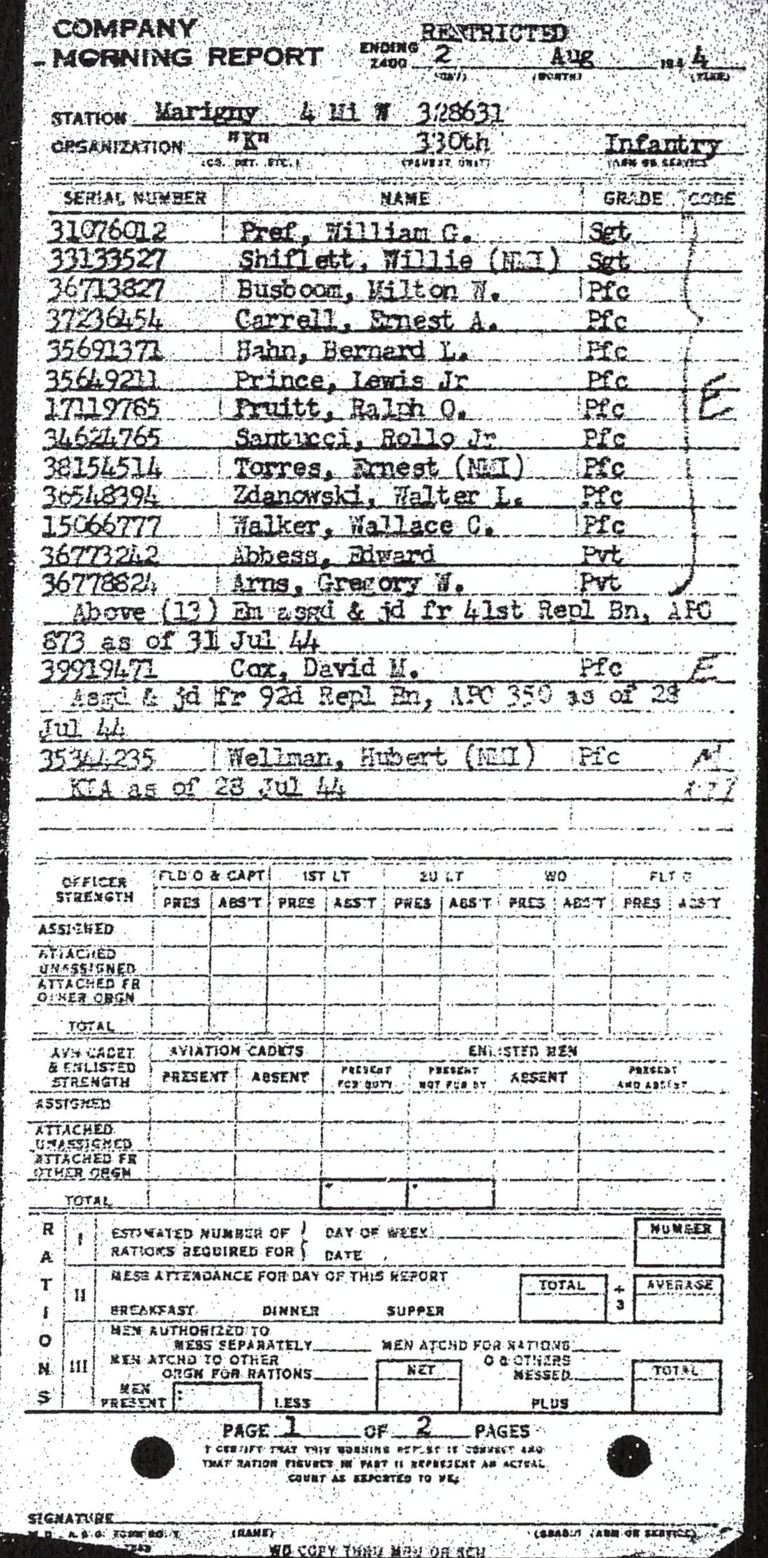| 1944-08-02 | PFC | Assigned and joined from 41st Replacement Battalion as of July 31, 1944 | K / 330 | view page | |