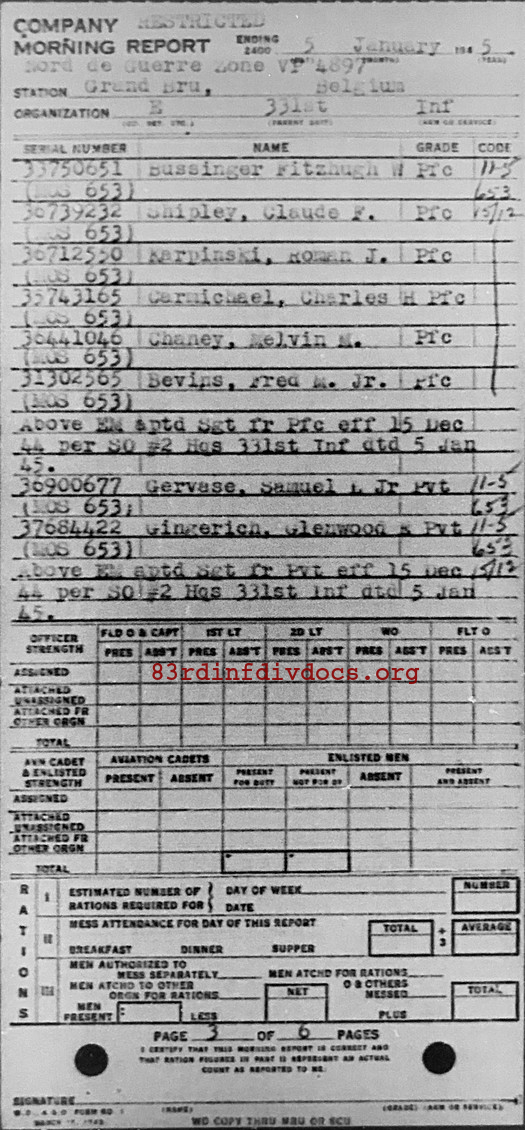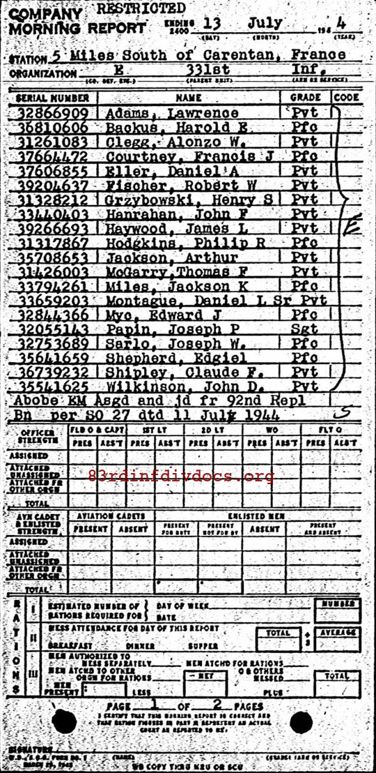 | Sergeant Shipley was a member of E Company. The morning report for July 13, 1944 on page 15 lists him joining the unit from the 92nd Replacement Battalion on July 11, 1944 as a Private. The morning report for August 1, 1944 on page 2 list his promotion to Private First Class. The pages can be seen below. Since we have no later documents we assume that Sergeant Shipley died while serving in E Company. |