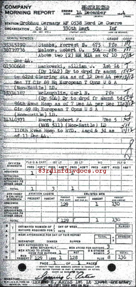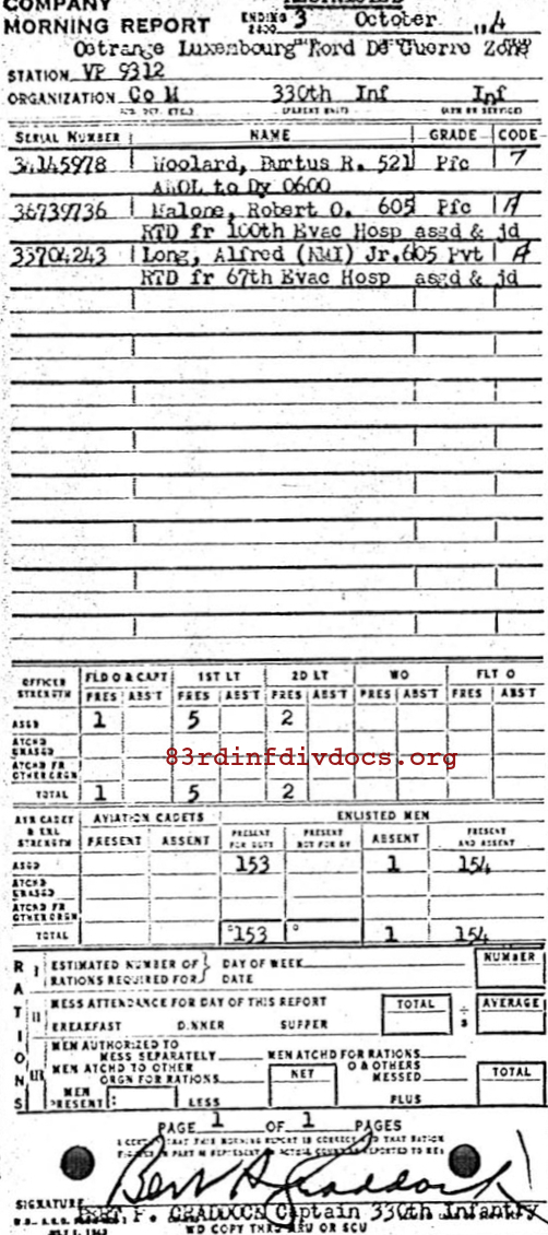 | Private First Class Malone was a member of M Company but he joined the 83rd as a member of H Company. The morning report for July 19, 1944 on page 27 lists him joining the unit from the 92nd Replacement Battalion on July 11, 1944. Page 38, for July 25, 1944, lists him as severely wounded in action and transferred to the 100th Evacuation Hospital. The morning report for October 3, 1944 on page 3 lists him returning to duty with M Company, from the 100th Evacuation Hospital. The morning report for December 14, 1944 on page 15 lists him as killed in action on December 10, 1944. The pages can be seen below. |