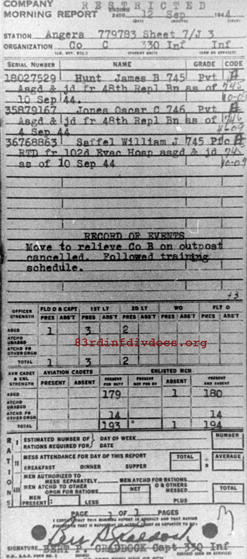 | 1944-10-02 | PVT | Transferred to M Company, 330th Infantry Regiment as of October 1, 1944 | 745 | C / 330 | view page |