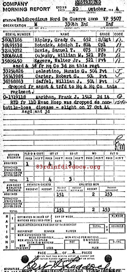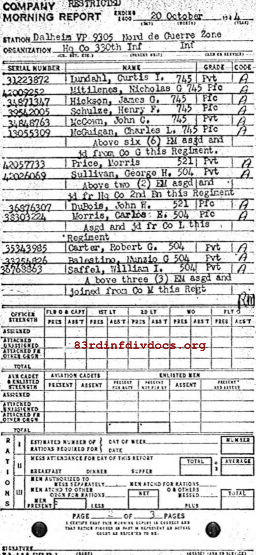 | 1944-10-20 | PVT | Assigned and joined from M Company, 330th Infantry Regiment as of October 20, 1944 | 504 | HQCO / 330 | view page |