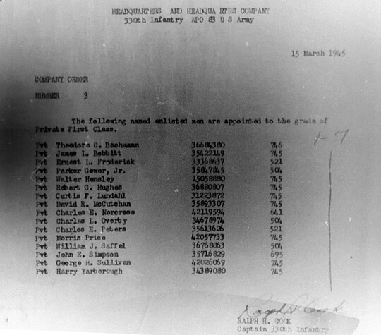 | 1945-03-15 | PVT | Promoted to Private First Class as of March 15, 1945 | 504 | HQCO / 330 | view page |