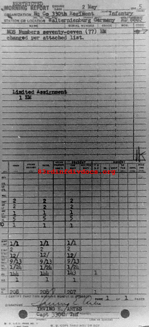 | Unit | Headquarters, 330th Infantry Regiment, 83rd Infantry Division |