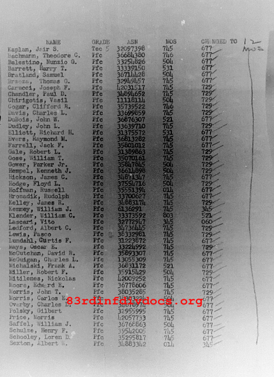 | 1944-10-20 | PVT | Transferred to Regimental HQ Company, 330th Infantry Regiment as of October 20, 1944 | 504 | M / 330 | view page |